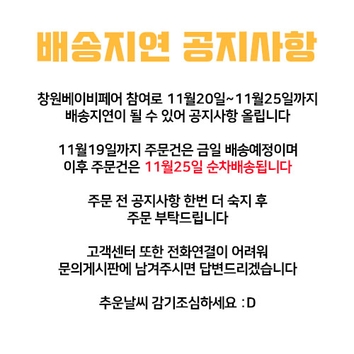 11월20일 ~ 11월25일 주문건은 베이비페어 참여로 배송지연되는 점 양해부탁드립니다.